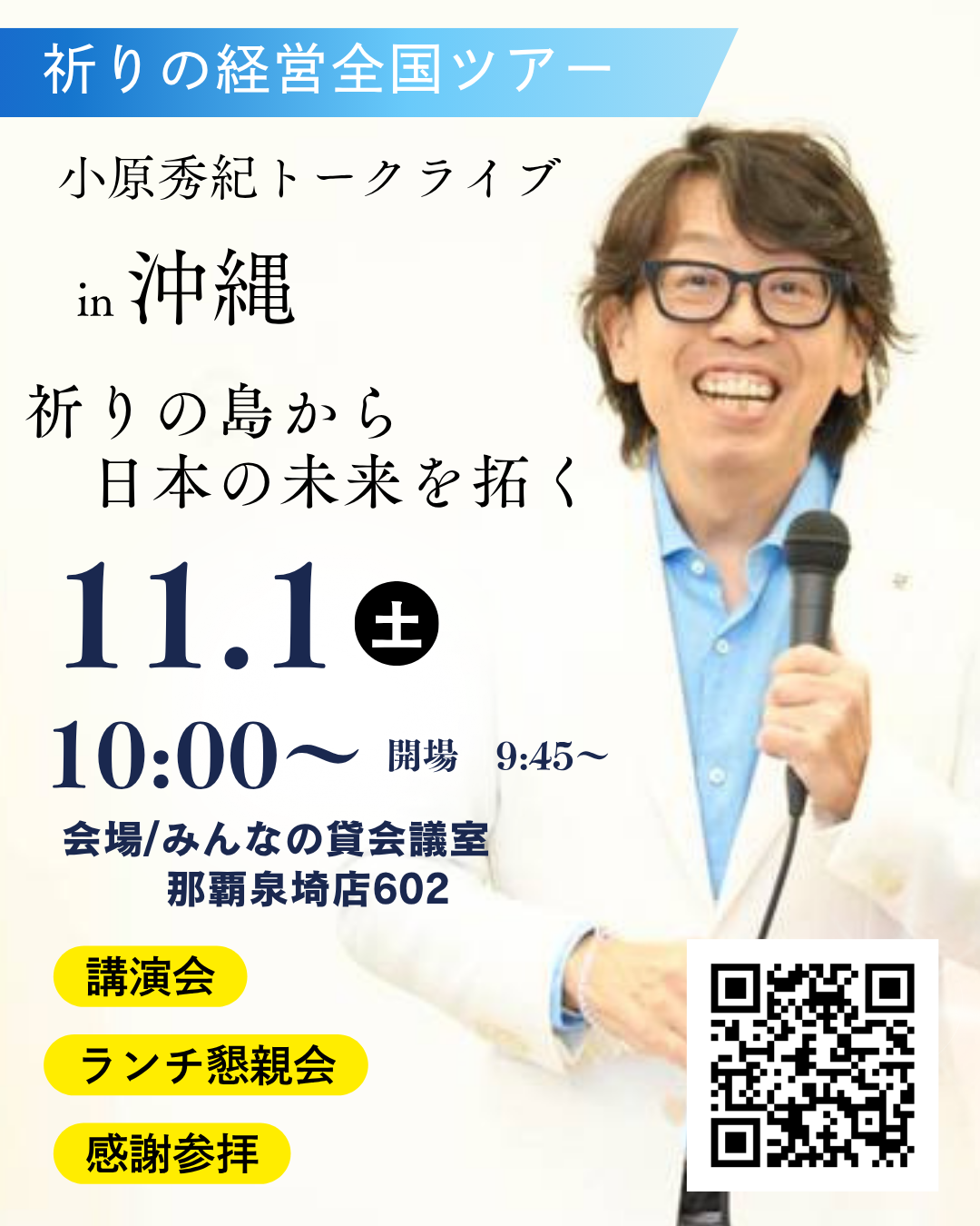 沖縄には、祈りが生きています。 自然と共に在り、人と人が助け合い、祖先への感謝が日常に息づく――その姿は、私たちが忘れかけている大切な心を映し出しています。 この“祈りの心”こそ、経営の原点であり、これからの日本を照らす 灯(あかり) です。 戦後の困難を越えてなお、笑顔を絶やさず、島の風のように柔らかく、そして強く生き抜いてきた沖縄。 その精神から、未来をひらくヒントが見えてきます。 ここから始まる全国ツアーは、「祈りの経営」 を通じて、日本に再び光を灯す旅。 共に歩むその一歩が、新しい時代をつくります。